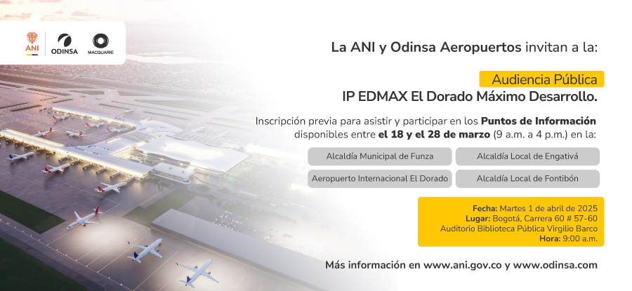 La ANI y Odinsa Aeropuertos invitan a la Audiencia Pública IP EDMAX El Dorado Máximo Desarrollo.