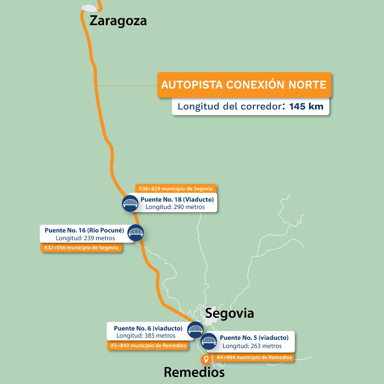 En tanto, el Puente 16, sobre el río Pocuné, en Segovia, cuenta con una longitud de 239 metros; y el Puente 18, en el K36+829 de este municipio, tiene una longitud de 290 metros y una altura de 27 metros.