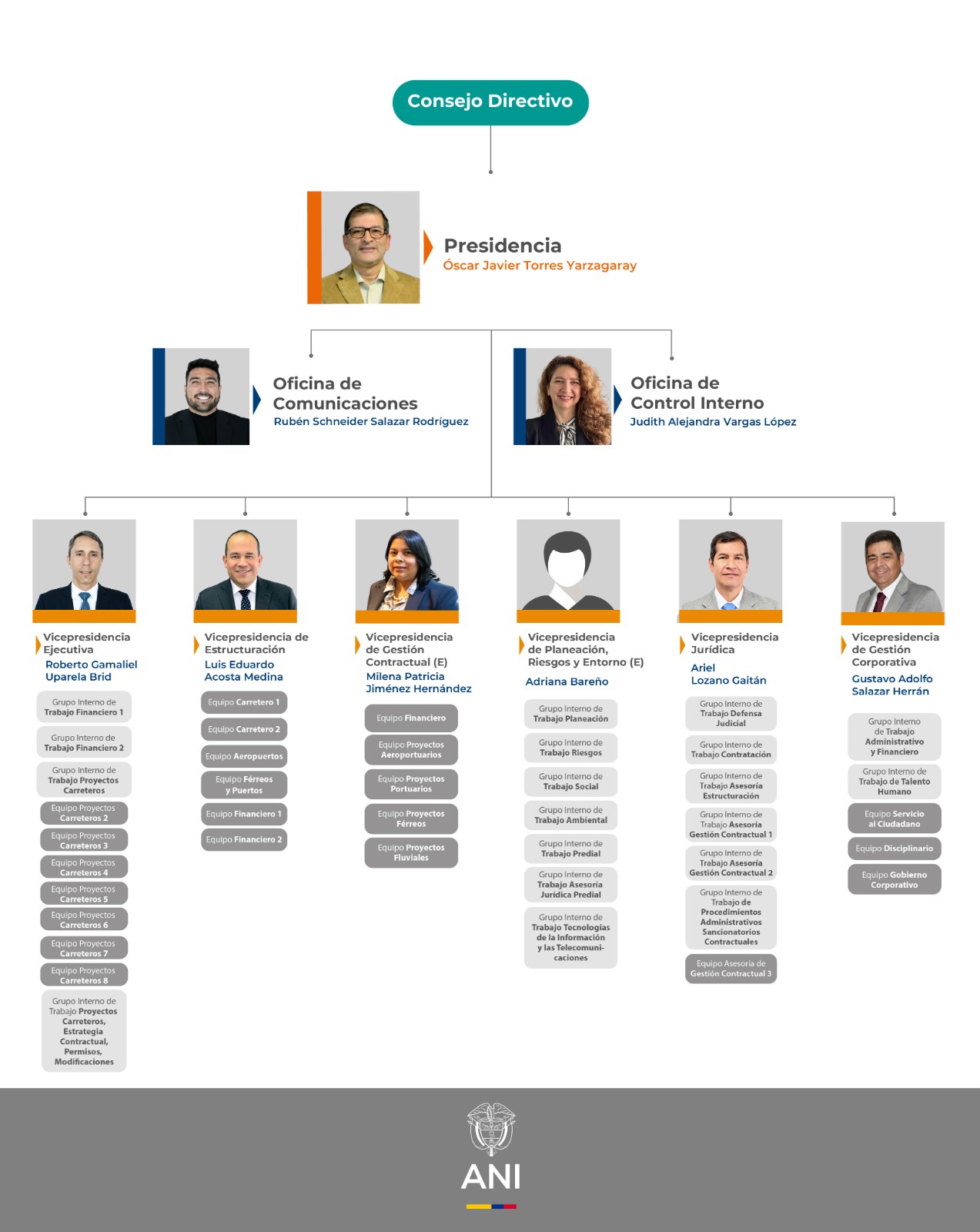 Consulte el Directorio Activo de Funcionarios Normatividad Consulte las funciones de las dependencias Consulte los Grupos Internos de Trabajo AdjuntoTamaño 16072025_organigrama_ani2025_v2.pdf1.32 MB