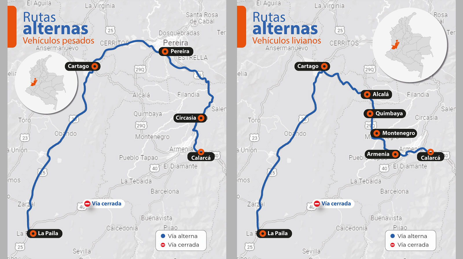 • Teniendo cuenta la falla súbita del puente vehicular 'La Vieja' en el corredor Calarcá - La Paila, se han definido las siguientes rutas alternas para los usuarios: