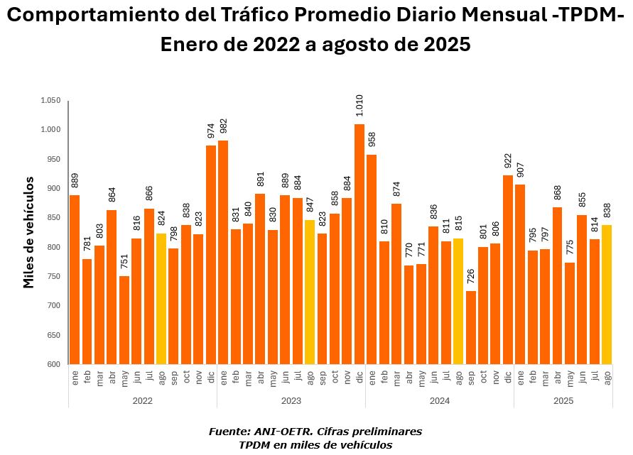 Informe mensual OETR agosto 2025 Fecha última actualización: 28/10/2025 El Tráfico Promedio Diario Mensual de la red vial nacional concesionada para el mes de agosto de 2025 fue de 838 mil vehículos, en tanto, para el mismo mes del año 2024 fue de 815 mil vehículos, agosto de 2023 fue de 847 mil vehículos y en agosto de 2022 el TPDM fue de 824 mil automotores. |