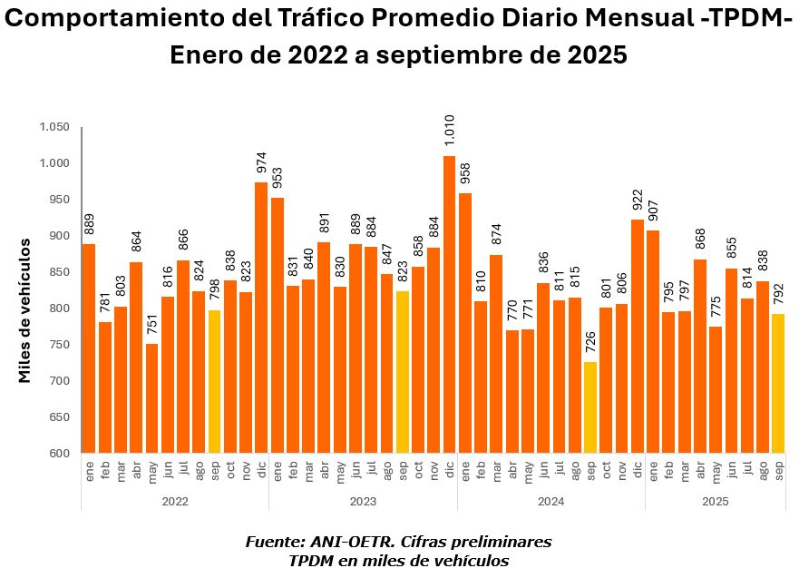 Informe mensual OETR septiembre 2025 Fecha última actualización: 28/11/2025 El Tráfico Promedio Diario Mensual de la red vial nacional concesionada para el mes de septiembre de 2025 fue de 792 mil vehículos, en tanto, para el mismo mes del año 2024 fue de 726 mil vehículos, en septiembre de 2023 fue de 823 mil vehículos y en septiembre de 2022 el TPDM fue de 798 mil automotores. |